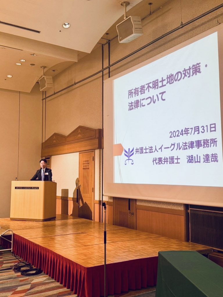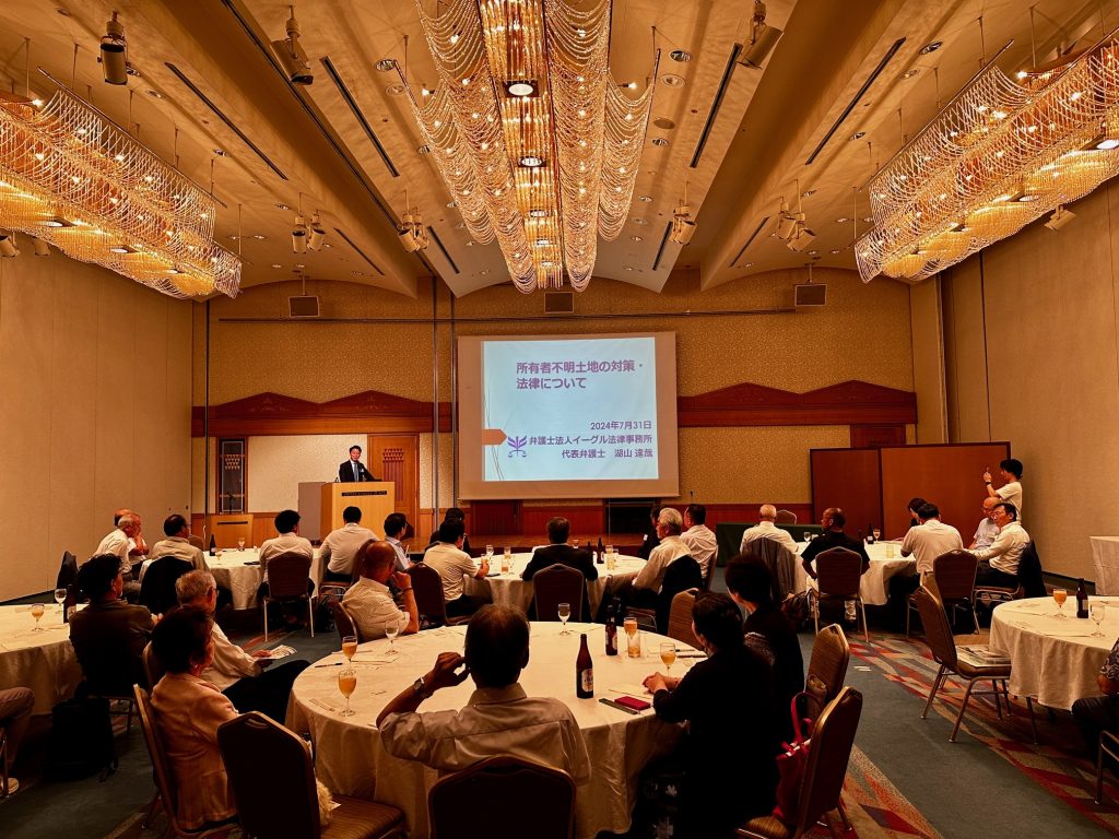今月は講師に会員の弁護士法人イーグル法律事務所 湖山達哉弁護士をお迎えし相続登記の義務化、所有者不明土地対策など最近、法改正になった土地関係についてご講演いただきました。
